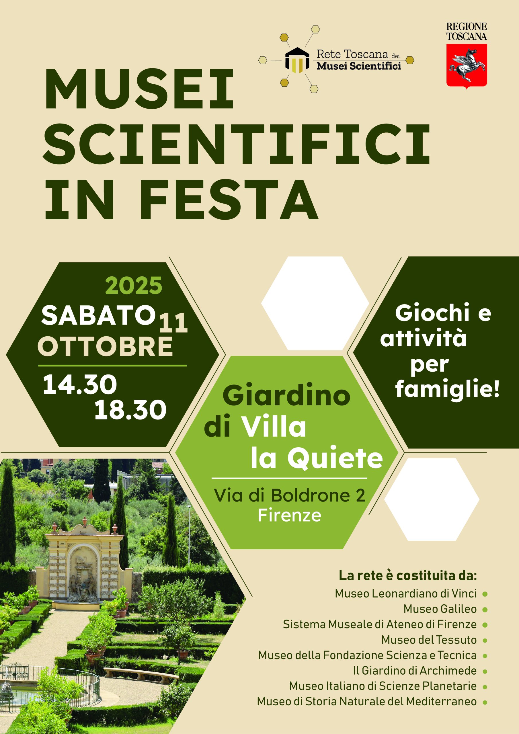 Sabato 11 ottobre Villa La Quiete aprirà le porte del suo splendido giardino per ospitare una giornata di festa dedicata ai Musei Scientifici Toscani. Sarà un’occasione unica per vivere in prima persona e provare attività, laboratori ed esperimenti, pensati per grandi e piccini, immersi nella natura e nella bellezza del luogo.