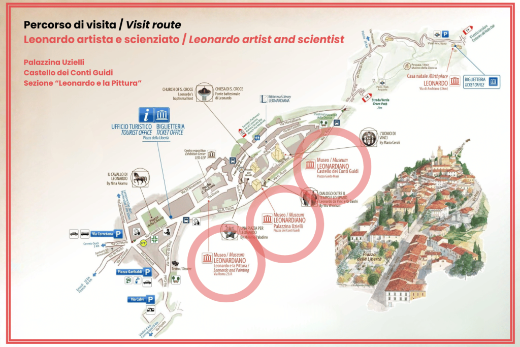 La Palazzina Uzielli è consigliata come inizio del percorso del Museo Leonardiano, dove la meccanica è il terreno fertile per un viaggio nella mente del Genio: si inizia con alcuni dei disegni più significativi che rimandano ai temi del percorso, presentati attraverso suggestive animazioni a cui seguono le sezioni sulle macchine da cantiere, sulla manifattura tessile e sugli orologi, in cui sono esposti i sorprendenti modelli che riproducono fedelmente gli scritti di Leonardo. Per tutti i visitatori sono disponibili nel percorso museale esperienze con visori per la realtà virtuale, attraverso cui poter interagire con i meccanismi ideati dal Genio Vinciano. Una esperienza davvero a 360 gradi, che si conclude poi nelle sale di anatomia: qui la mente di Leonardo passa dallo studio dei movimenti delle macchine a quelli del corpo umano. Grazie a pregiate ceroplastiche, alcuni dei meravigliosi disegni leonardiani diventano realtà, passando dall’inconfondibile tratto dei suoi celeberrimi fogli a vere e proprie sculture da ammirare a tutto tondo.